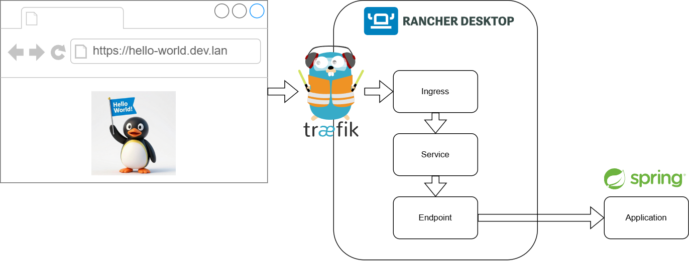 In this example the request from the browser is routed through Traefik (Ingress Controller) and through the Kubernetes in Rancher Desktop and utilizes the spring-boot application running outside of Kubernetes.